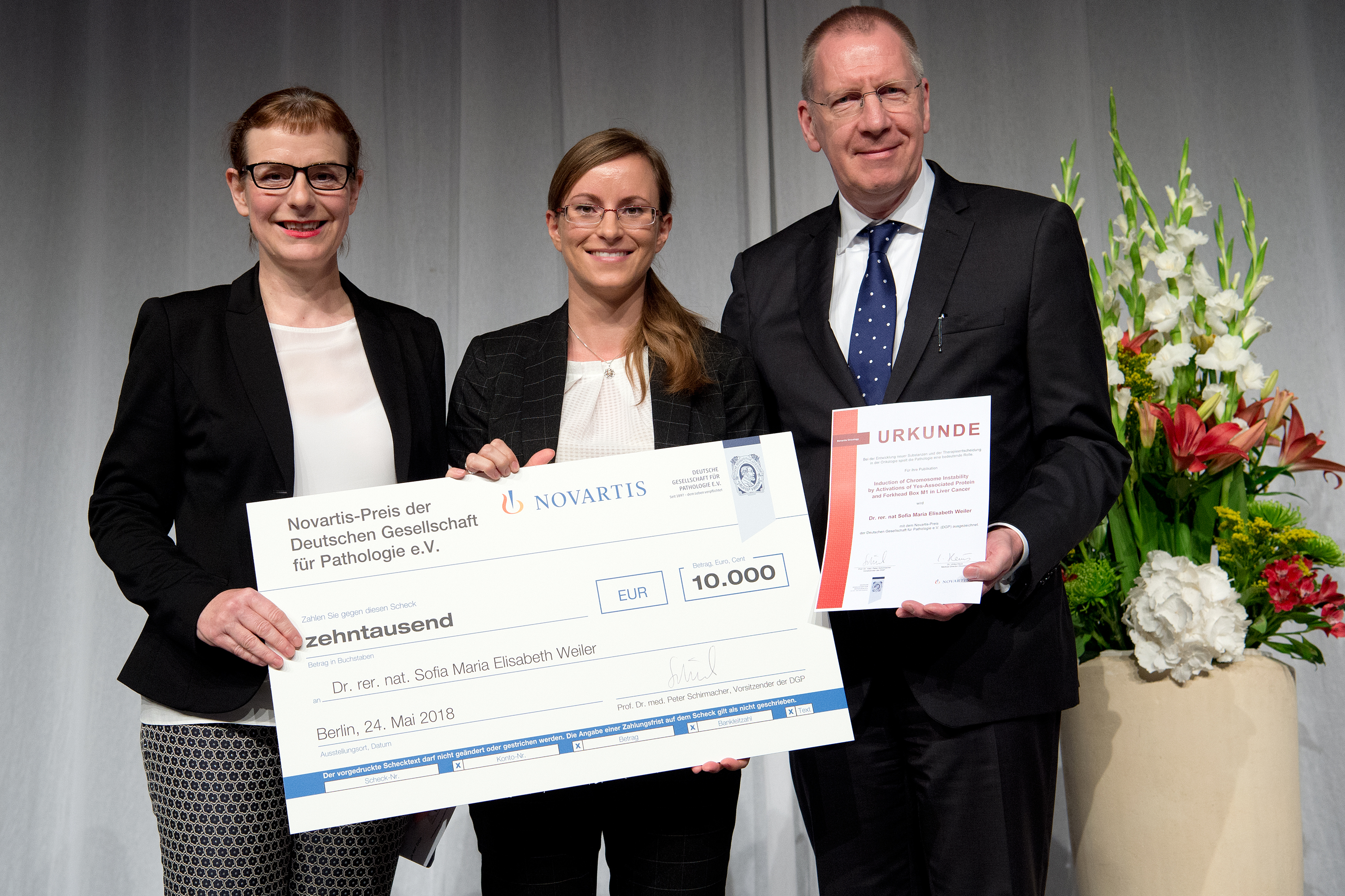 Bereits zum vierten Mal fördert die Deutsche Gesellschaft für Pathologie (DGP) mit dem Novartis-Forscherpreis herausragende grundlagenorientierte und translationale Forschungsarbeiten zur Pathogenese und Diagnostik von Erkrankungen. Der diesjährige Preis wurde im Rahmen der Eröffnungsveranstaltung der DGP-Jahrestagung in Berlin verliehen.