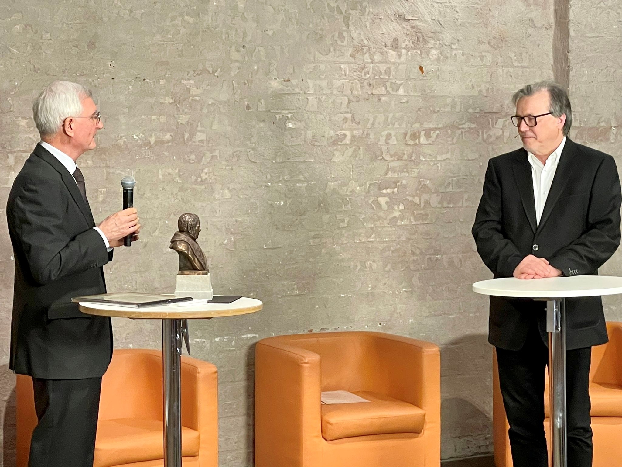 Den Preis, eine Skulptur von Johann Lukas Schönlein, überreichte ihm Professor Gerhard Seitz als wissenschaftlicher Leiter der Bamberger Morphologietage, die Laudatio hielt Professor Veit Krenn aus Trier.
